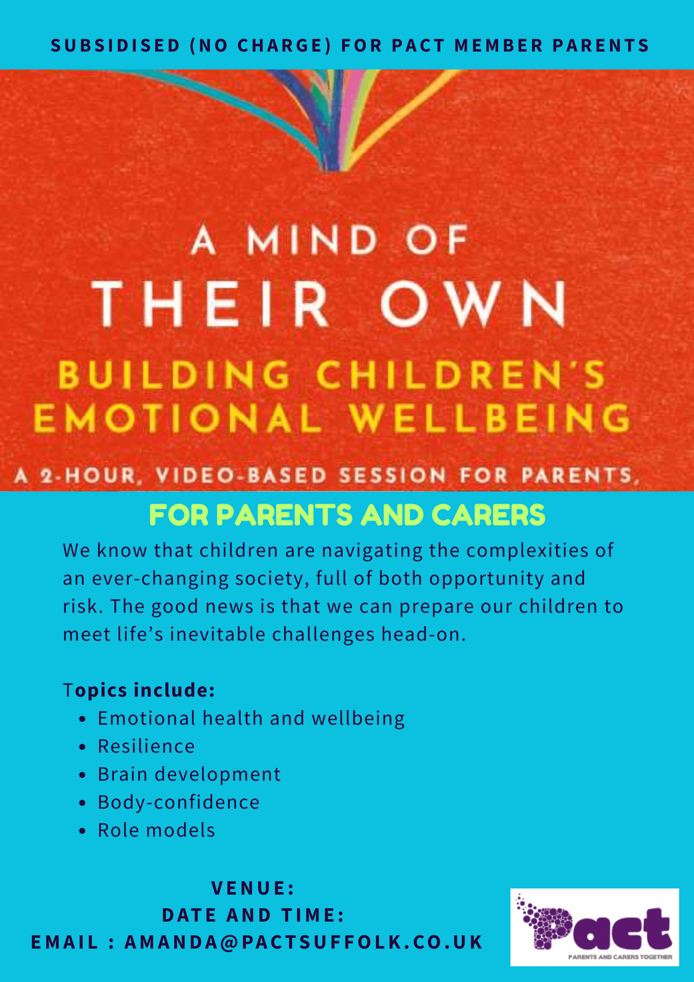 June 2020 - PACT became PACT Parents and Carers Together CIC to support us in our vision of becoming sustainable into the future and ensuring we continue to offer this level of support etc. for all families in Suffolk caring for a child or young person with mental health issues.