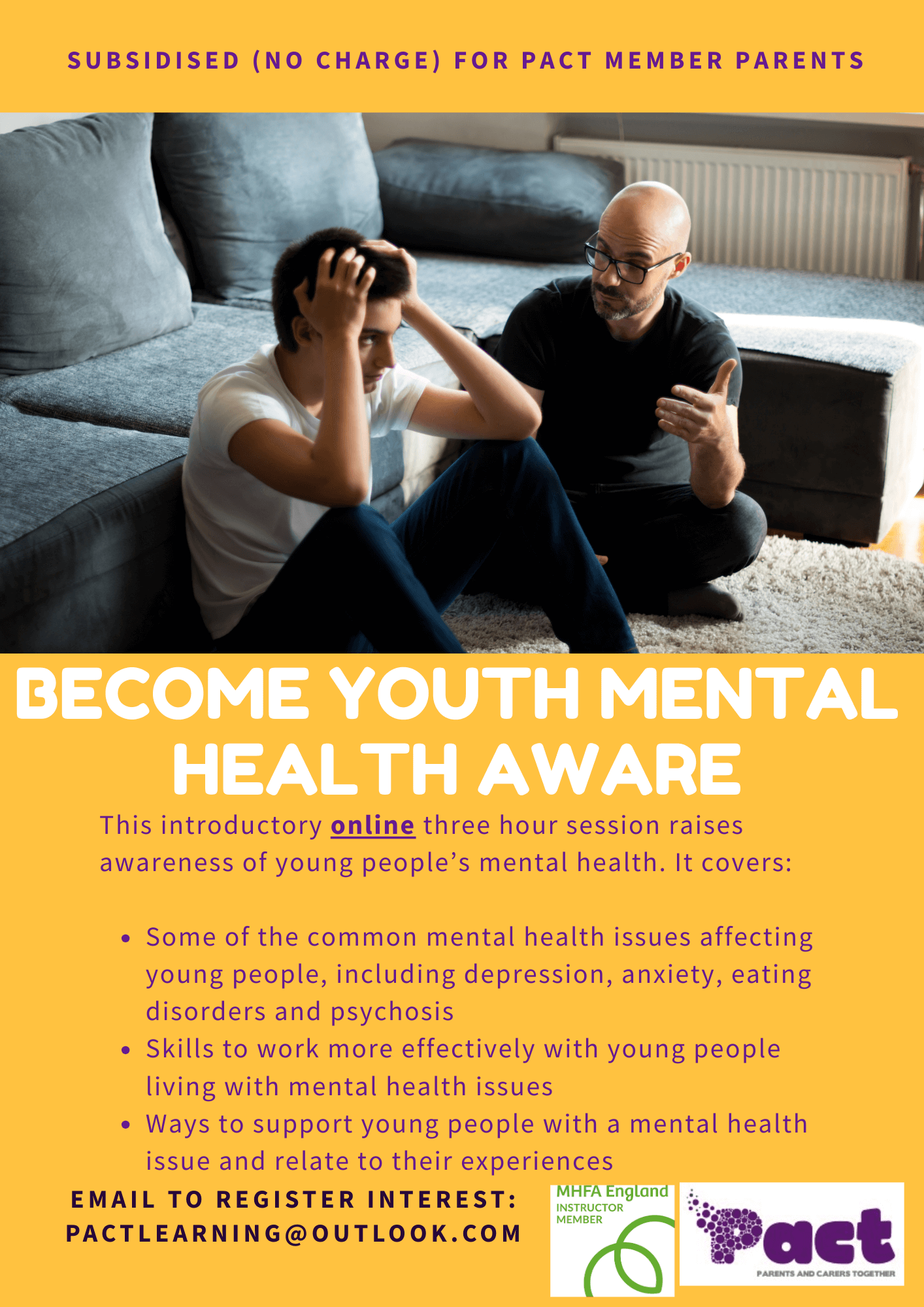 We have recently run webinars and workshops on supporting a young person with an eating disorder, low mood in children and young people and sleep issues. We currently have upcoming workshops from Dr Beth Mosley (NSFT) on "supporting a young person in returning to school", and "Attention seeking? Or something else?" a workshop around self-harm provided by Satveer Nijjar http://satveernijjar.com/ on 22nd March. To join any of our workshops or webinars (there is no charge) you will find the links in the closed group (details above).