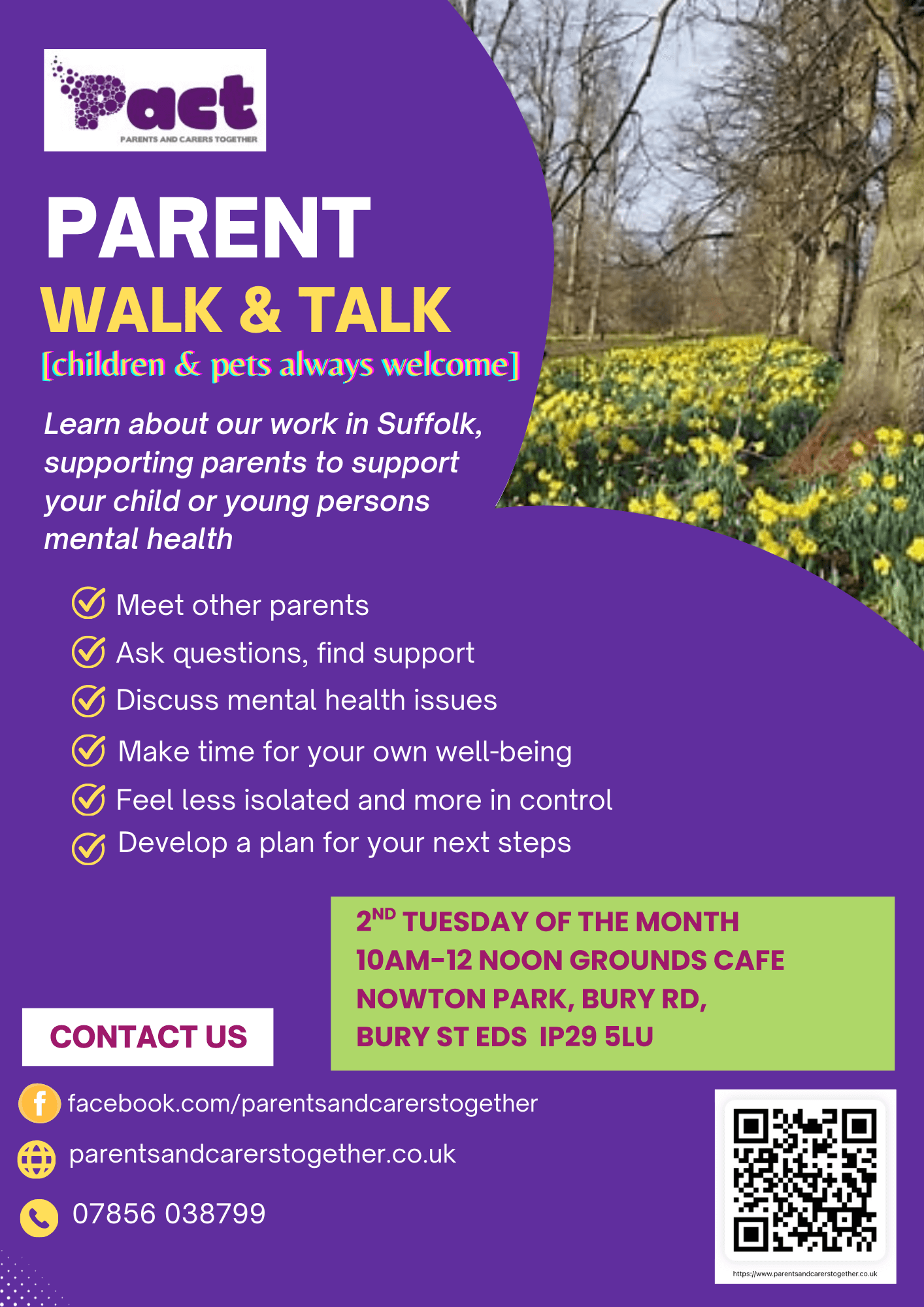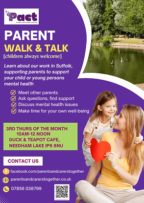 Bury St Edmunds walk and talk sessions are every second Tuesday of the month, meet at the Grounds cafe, Nowton Park at 10am and we will enjoy a relaxing walk around the parkland with a safe space to connect and discuss any experiences or issues with like-minded parents and our trained facilitator (with lived-experience). Refreshments provided either before or after the walk.